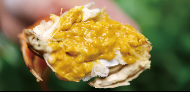 每逢炎夏,青母蟹會(huì)在產(chǎn)卵時(shí)棲身于淺灘河畔,在陽光的照射下,體內(nèi)的蟹膏分解成金黃色的油脂,然后滲透到體內(nèi)的各個(gè)部分,使得整只蟹晶瑩剔透、充滿黃油,因此被稱為黃油蟹。